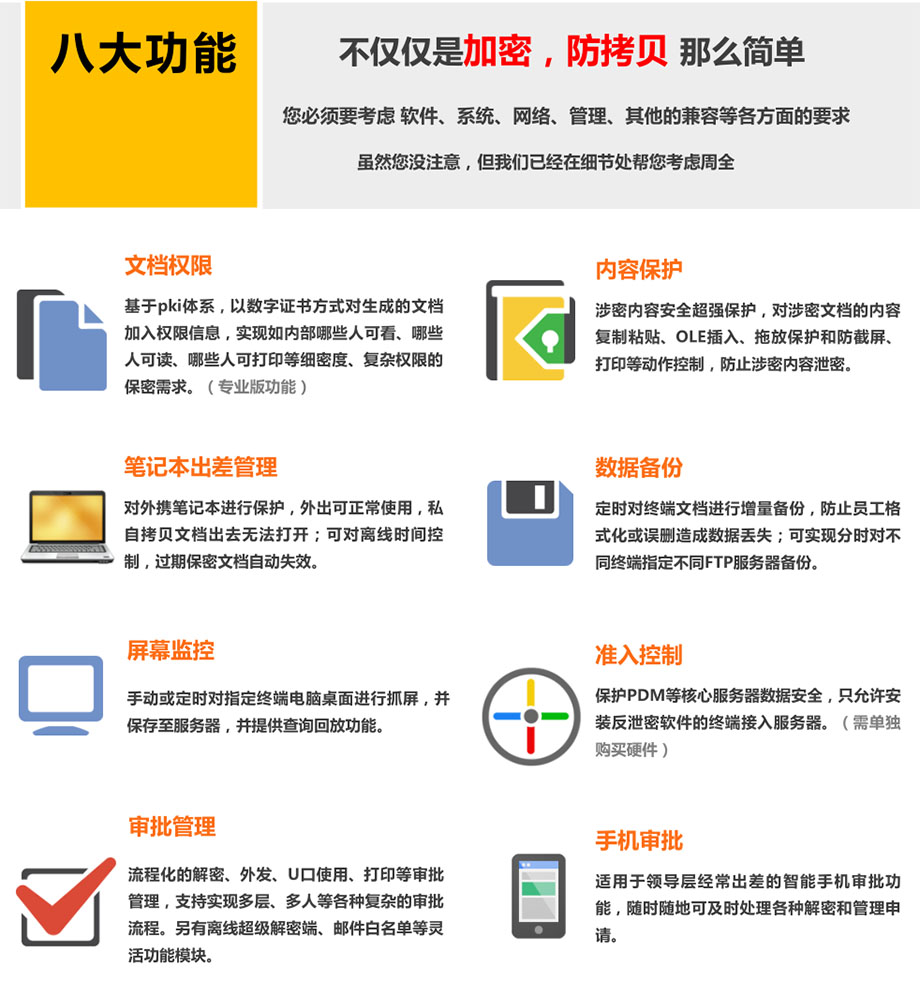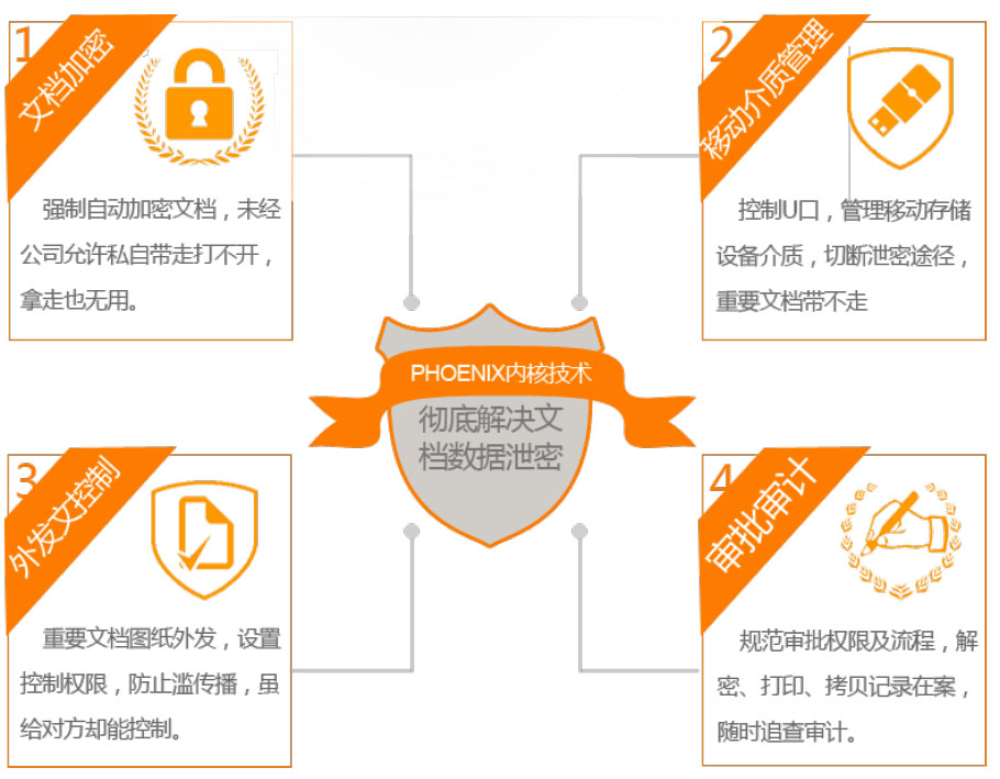 加密系統(tǒng)集身份認(rèn)證與權(quán)限管理、U盤管控、打印控制、程序控制、日志監(jiān)控、自動(dòng)備份、外發(fā)文件控制等多功能模塊于一體的反商業(yè)泄密系統(tǒng)軟件,是國內(nèi)最先進(jìn)、最穩(wěn)定、最安全的解決信息安全泄密問題的方案。